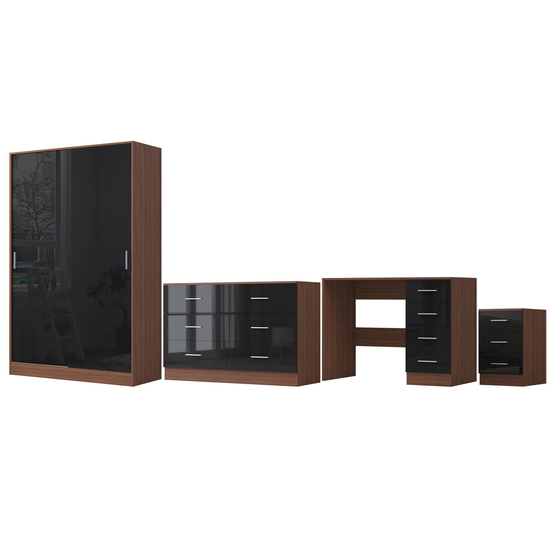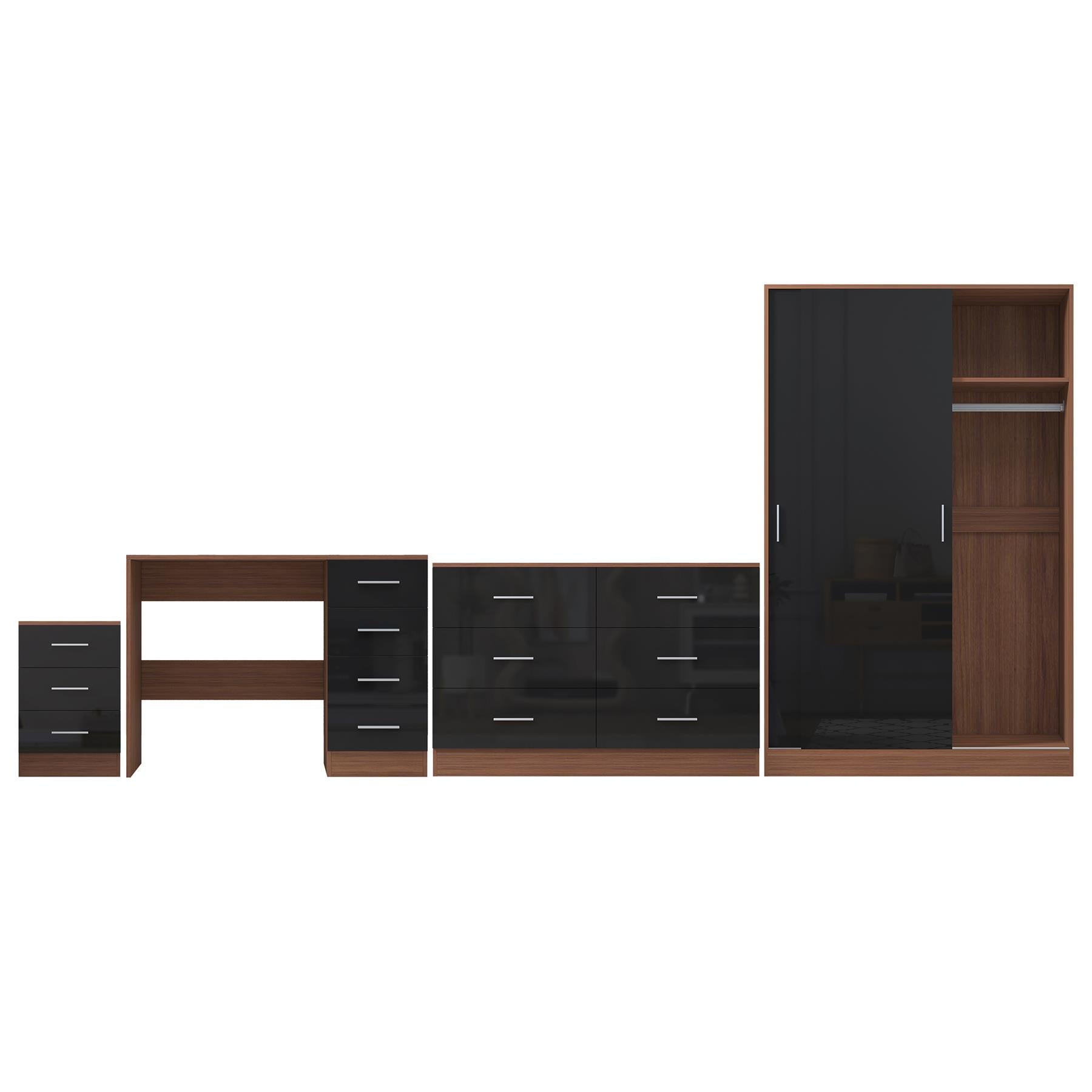 Reflect 2 Door Sliding Wardrobe, 6 Drawer Wide Chest, 3 Drawer Bedside, 4 Drawer Desk – Black Gloss & Walnut – Modern Bedroom Furniture Set