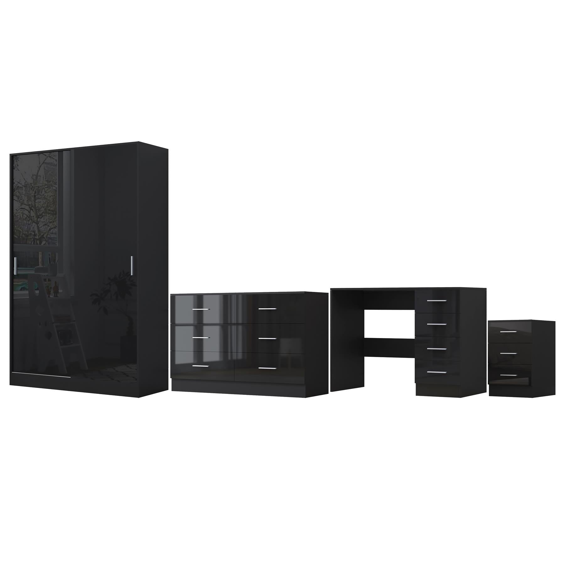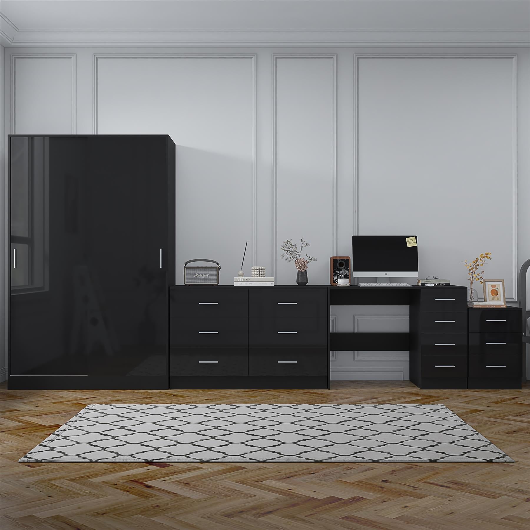 Reflect 2 Door Sliding Wardrobe, 6 Drawer Wide Chest, 3 Drawer Bedside, 4 Drawer Desk - Black Gloss & Black Oak - Modern Bedroom Furniture Set
